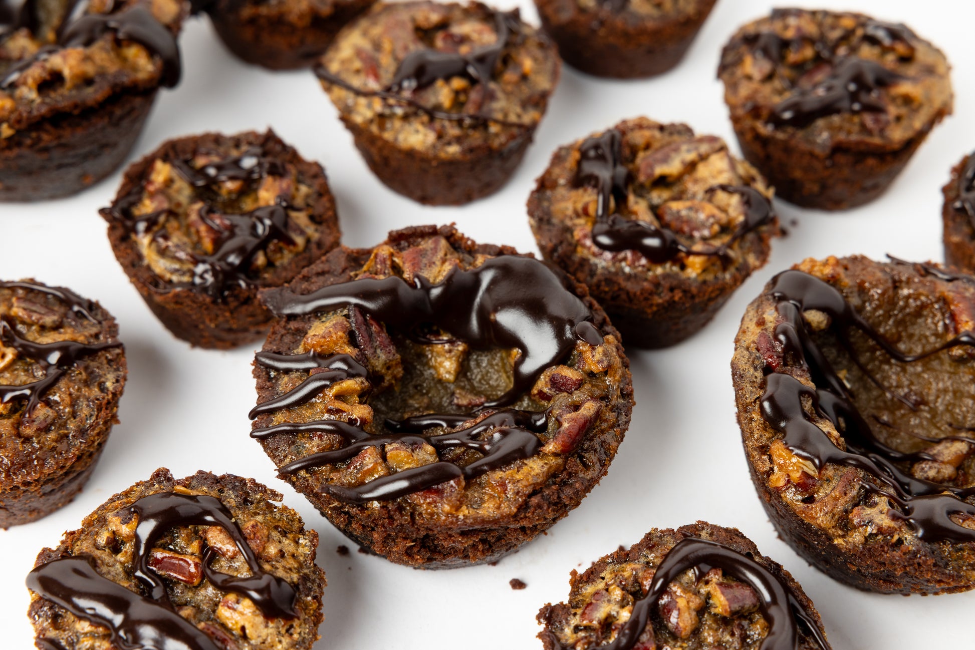 Chocolate butter tarts with added toasted pecans. Available packs of 6 regular size or 12 mini tarts. ( Pictured is our chocolate tarts. Imagine these with pecans, if you pecan).