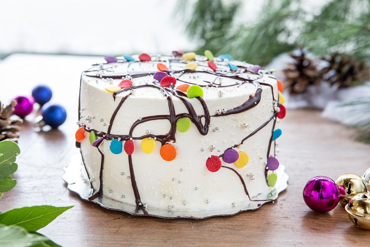 Christmas lights (a.k.a. M&M's ) and other bling adorn strings of chocolate ganache on our chocolate cake topped with vanilla icing.