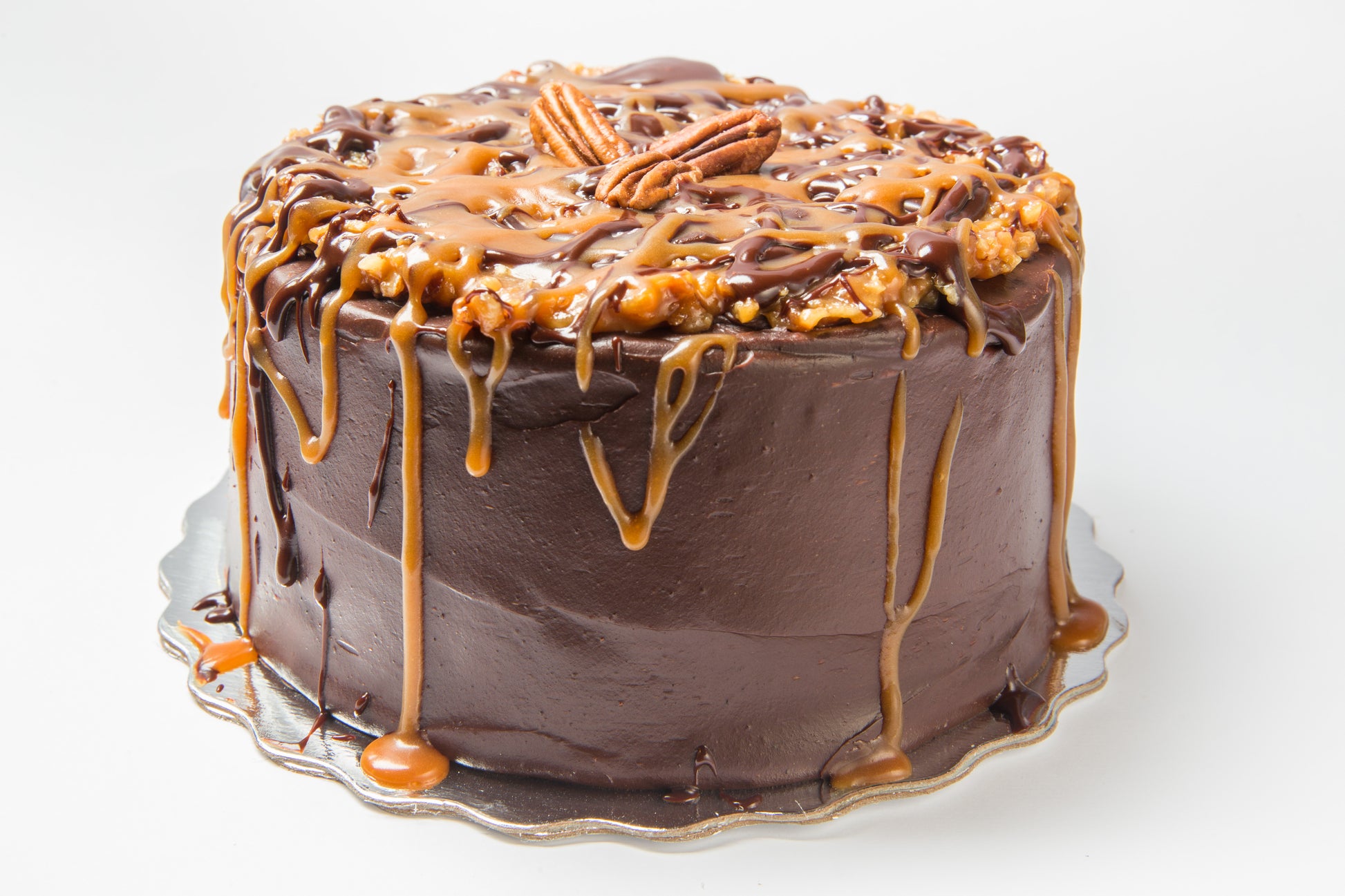 Rich, moist chocolate cake smothered in a gooey blend of caramel, toasted coconut, and crunchy pecans- all held together by our decadent fudge frosting. It's sticky, sweet, and wildly satisfying.